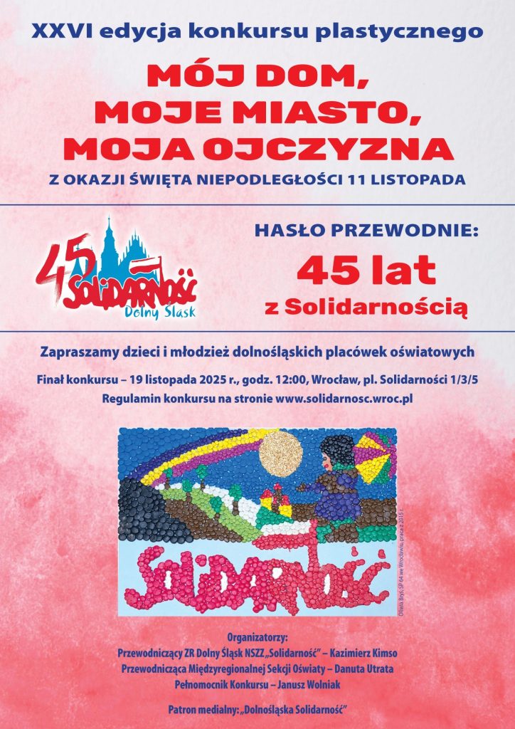 Finał XXVI edycji Konkursu „Mój dom, moje miasto, moja ojczyzna” odbędzie się 19 listopada 2025 r. o godz. 12.00 w siedzibie Zarządu Regionu NSZZ „Solidarność Dolny Śląsk – pl. Solidarności 1/3/5, 53-661 Wrocław.